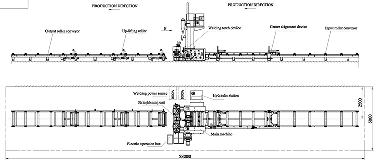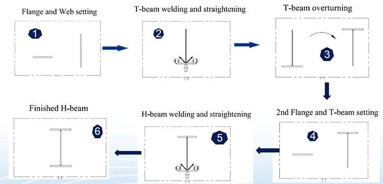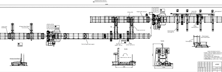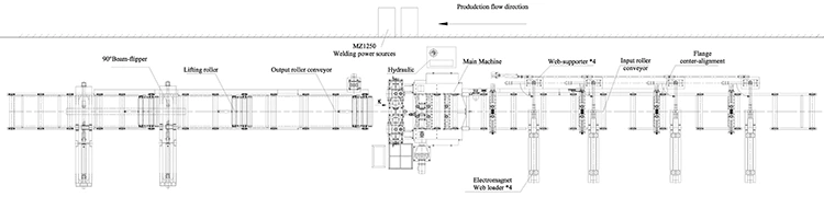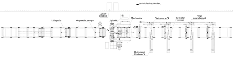 一部の顧客は、生産出力を増やす必要がある場合があります。2セットの溶接ステーションで構成されているために1つの溶接ラインが必要です。1番目のフランジとWebの最初の溶接ステーションは、Tビームを形成し、溶接Tビームと2番目のフランジを溶接してHビームを形成するための2番目の溶接ステーションです。
